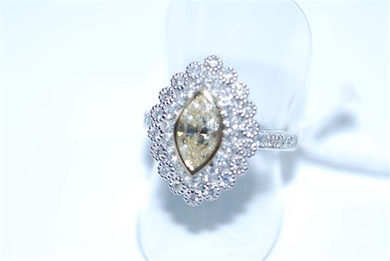 A DIAMOND CLUSTER RING CENTRALLY SET WITH A MARQUISE DIAMOND WEIGHING APPROXIMATELY 1.01CTS WITH DIAMOND SURROUND AND SHOULDERS IN 18CT WHITE GOLD