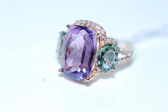 AN AMETHYST, SAPPHIRE AND DIAMOND DRESS RING IN 18CT ROSE GOLD, INDEPENDENT VALUATION AVAILABLE