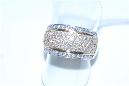 The wide band with central panel of pave set round brilliant cut diamonds, within a border of further diamonds, altogether totalling 1.0ct, in 18ct gold, ring size N-O.