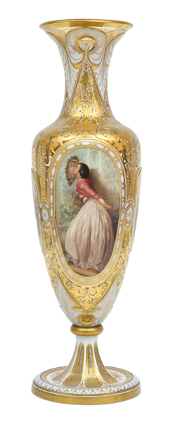 Hand painted with figurative and floral cartouches within enamel and gilt reserves