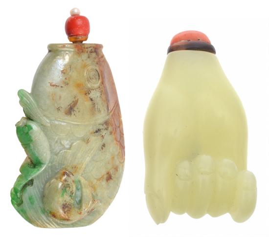 Together with a jade hand shaped snuff bottle with coral and tortoiseshell stopper