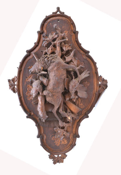 A CARVED BLACK FOREST HUNTING WALL PLAQUE