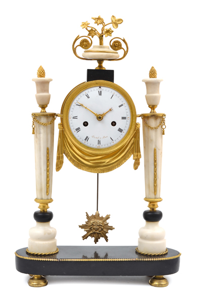The enamelled dial supported between twin columnar pedestals, count wheel strike silk suspension escapement