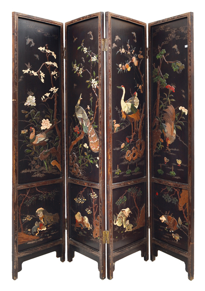 Scenic panels displaying birdlife above and mythical beasts below