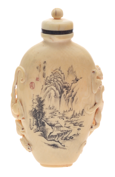 Carved with low relief chilong to each side, painted with landscape and calligraphy vignettes