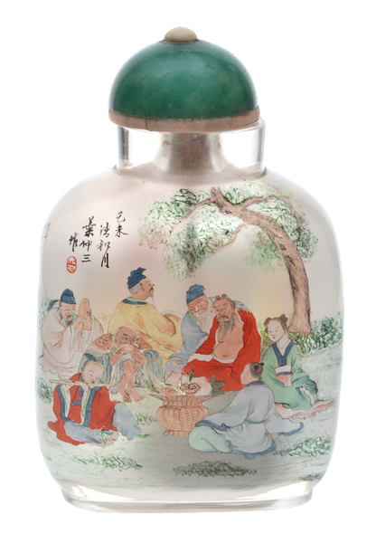 Hand painted with a scene of Buddhist deities to front and scholars to verso