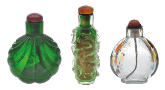 a carved and scalloped green bottle and a clear glass 'end of day' bottle
