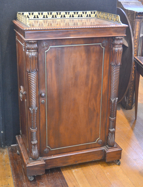 A 19TH CENTURY GALLERY EDGED AND CUT BRASS INLAID MAHOGANY SIDE CABINET