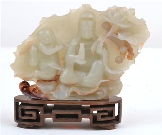 Carved within a leaf shaped surround above crashing waves, a Guanyin and attendant