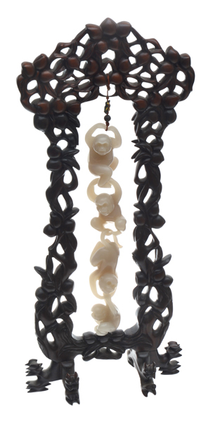 Carved and interlocking the monkeys suspended within a pierced and carved frame