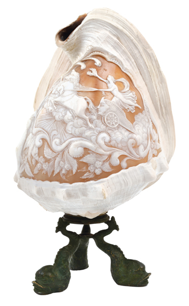 Carved with a neo classical scene raised on a tripod dolphin foot