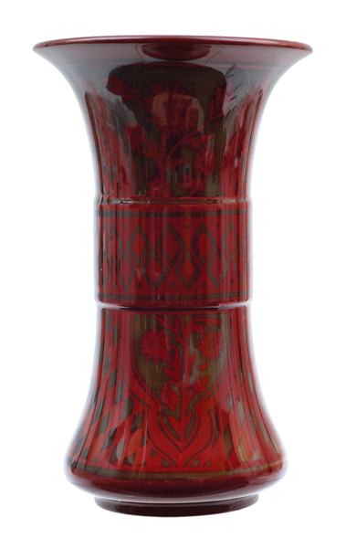 Tubular, glazed oxblood red with a resist floral and geometric pattern