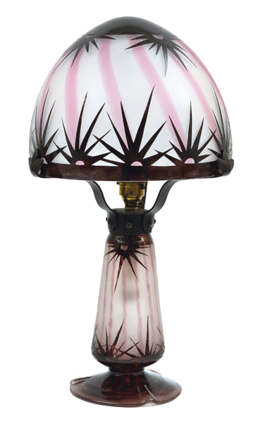 High domed shade with matching base, cut with geometric motifs on a striped ground