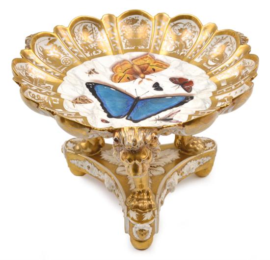 Scallop edged dish raised on a tripod base decorated with butterflies and beasts