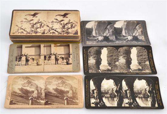 Makers incl Keystone View Co., H.C.White Co., Universal Sterescopic View Co., The Keraton Stereoscopic Nature Studies, Underwood & Underwood, views incl Belted Kingfisher, N.Z hawks, African lioness