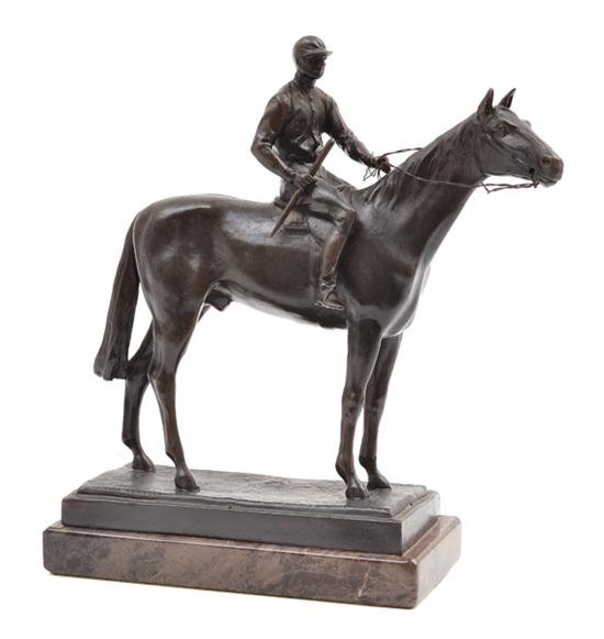 Styled as a jockey and mount raised on stepped bronze and onyx base