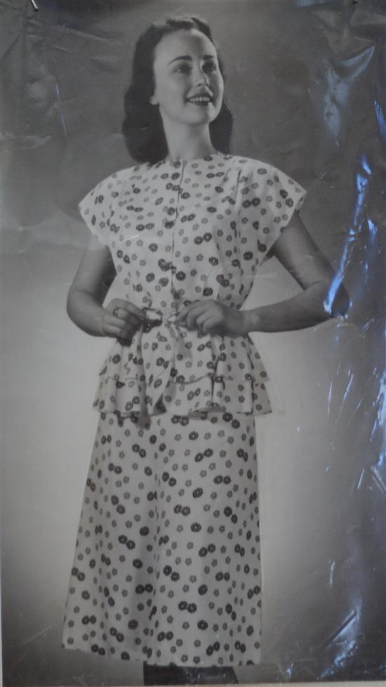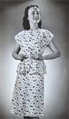 Fashion photograph of a model wearing a floral patterned dress (possibly for Adelyn Clothing)