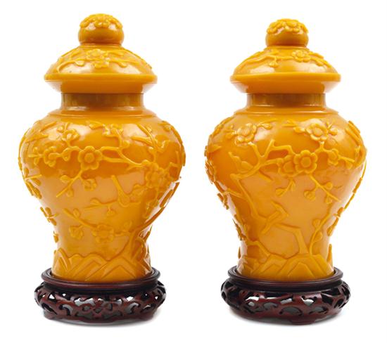 Each meiping with domed covers, carved with flowering prunus branches and birds