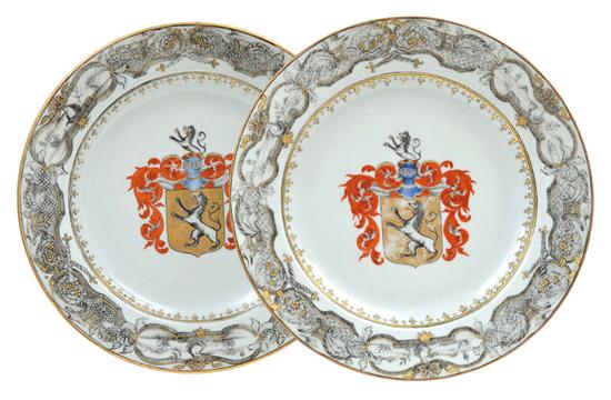 Each with a central armorial crest within a grisaille and gilt border