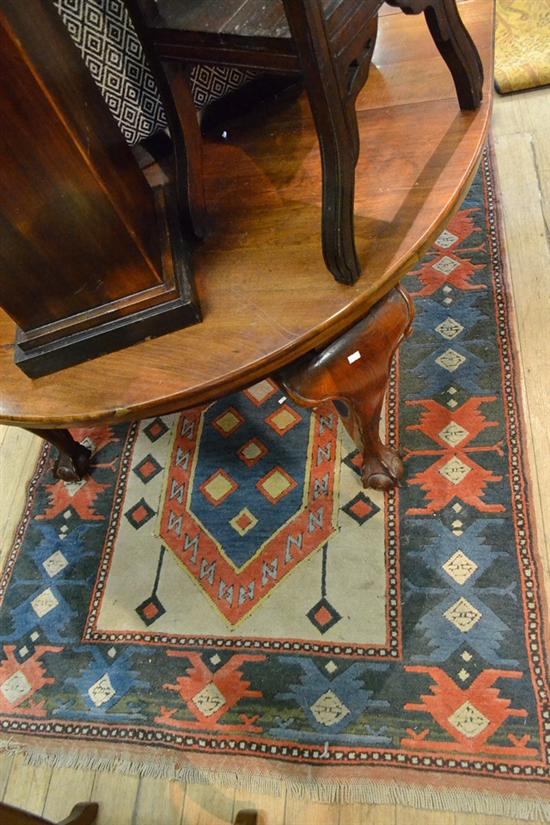 AN AZTEC STYLE RUG IN BLUE, ORANGE, CREAM TONES