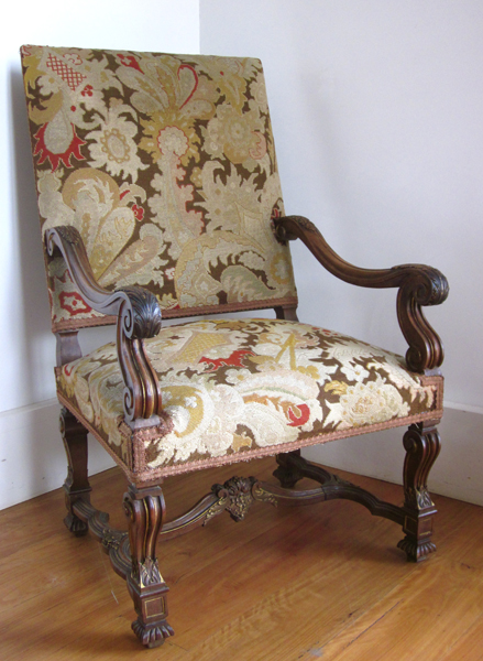Elaborately carved with trace gilding, upholstered in original tapestry.