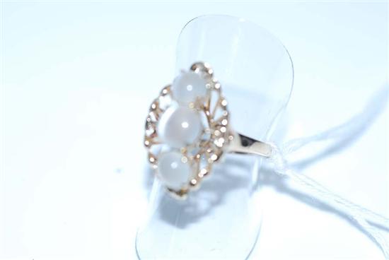 A THREE STONE CABOCHON MOONSTONE DRESS RING IN 14CT GOLD