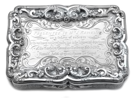 Incised dedication to lid Presented to Mr.J Rankine / as a token of esteem / by the workmen employed under him in the Engineering department / of the Eastern Counties railway Feb:5:1848 / "Should Auld acquaintance be forgot"