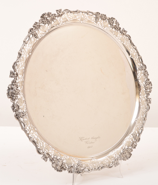 Circular, the rim pierced and cast with grapes and vine leaves, inscribed ' Kindest Thoughts / "Veritas" / 1947,' 2505grs. total weight of silver, 49.5cm diameter.