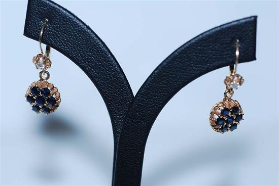 A PAIR OF SAPPHIRE CLUSTER EARRINGS TO DIAMOND SET EUROPEAN HOOK FITTINGS IN 9CT GOLD