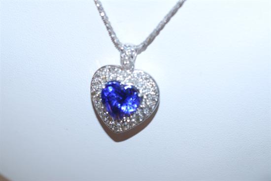 A TANZANITE AND DIAMOND PENDANT - Centrally set with a heart cut tanzanite weighing 6.50cts, within a double border of round brilliant cut diamonds totalling 1.70cts, suspended on a fine fancy link chain, in 18ct white gold.