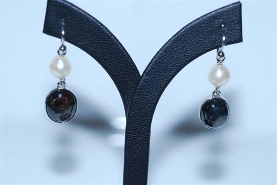 A PAIR OF BLACK SAPPHIRE AND FRESHWATER PEARL EARRINGS IN 18CT WHITE GOLD