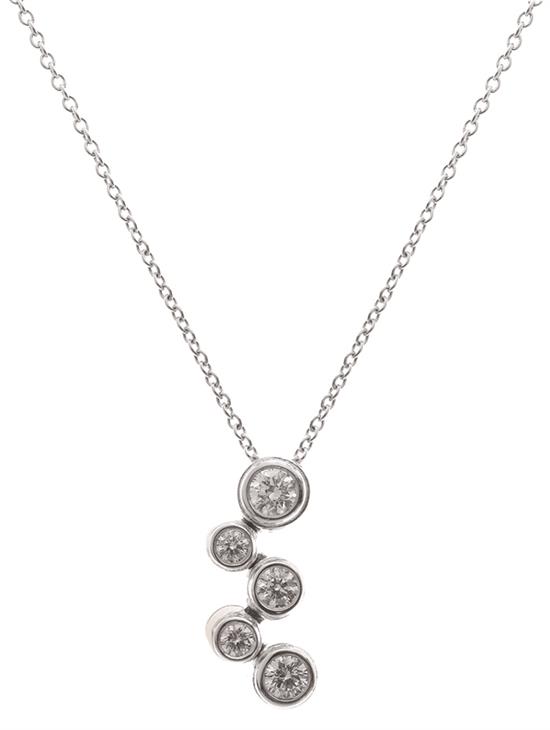 From the 'Bubble' collection, set with five round brilliant cut diamonds totalling 0.45cts, suspended on a fine belcher link chain, all in platinum, circa 2003.