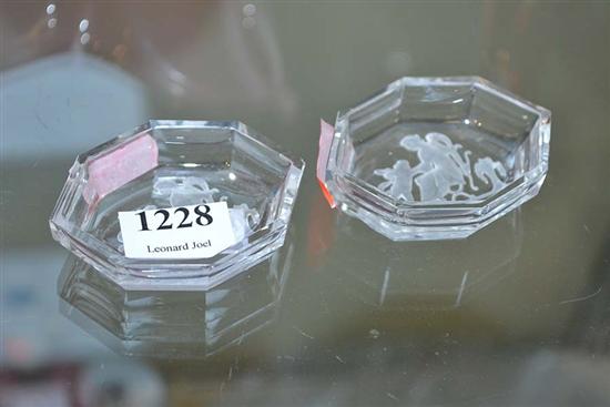 A PAIR OF ART DECO BEVELLED EDGE CRYSTAL CAMEO DISHES, 6CM WIDE