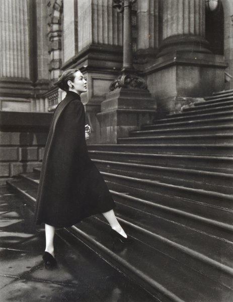 Helen Homewood Models a Wool Cape for the Australian Wool Board on the Steps of Parliament House, Melbourne 1961