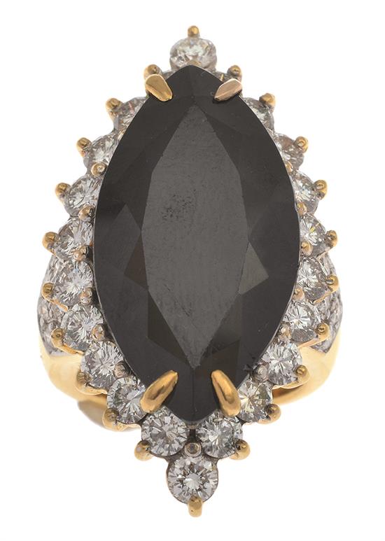 Centrally set with a marquise cut black melanite garnet weighing 19.74cts, within a border of round brilliant cut diamonds and diamond set shoulders totalling 2.74cts, in 18ct gold, independent valuation available, ring size G-H.
