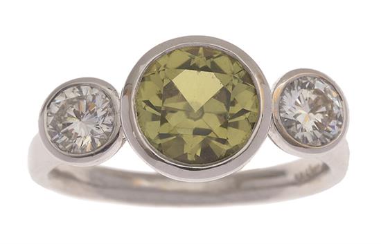 Centrally bezel set with a peridot weighing 2.0cts, flanked by a round brilliant cut diamond to either side, together totalling 0.75cts, in 18ct white gold, independent valuation available, ring size L-M.