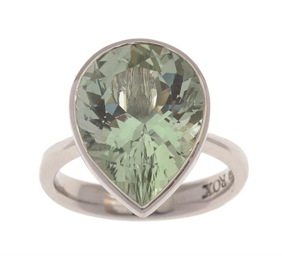 Comprising a pear cut green beryl weighing 8.10cts, bezel set in 18ct white gold, independent valuation available, ring size N-O.