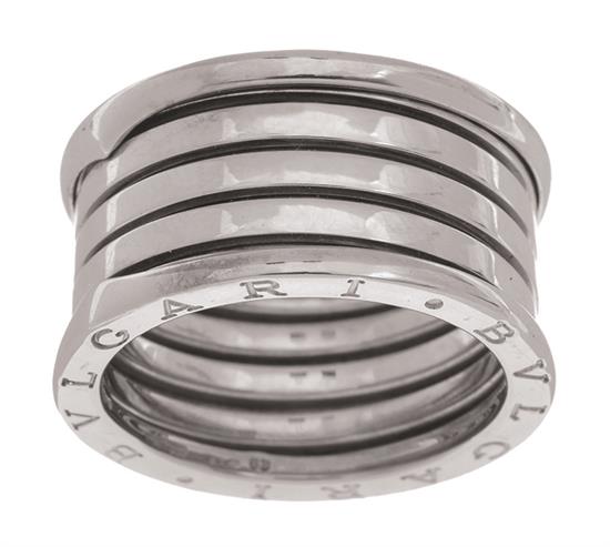 From the 'B Zero 1' collection, comprising a central spiral within lateral rims, in 18ct white gold, ring size T-U, boxed.