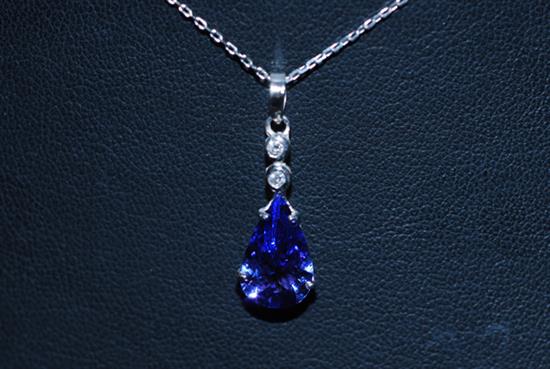 A PEAR CUT TANZANITE AND DIAMOND PENDANT TO FINE TRACE CHAIN ALL IN 18CT WHITE GOLD