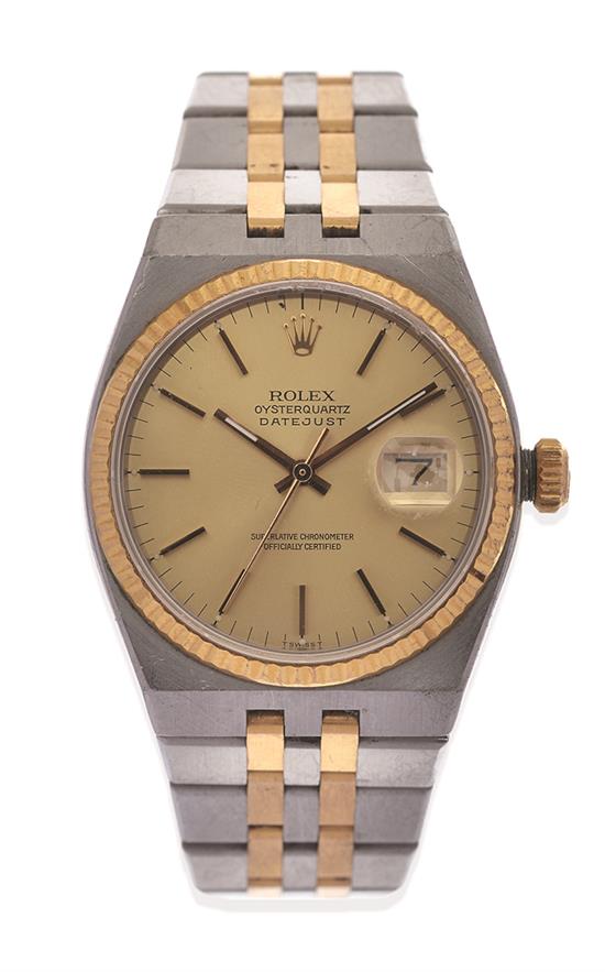 Quartz movement, circular gilded dial with raised baton numerals, date aperture at three, signed case, dial and movement, 18ct gold and stainless steel case and conforming bracelet bands, case reference number 17000, serial number 0060944, calibre 5035, 30mm diameter, circa 1985, with box and papers.