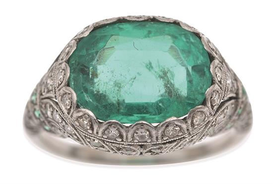 Centrally set with an oval emerald weighing 4.15cts within a domed diamond set gallery and shank set with single cut diamonds and further emerald detail in millegrain decoration, in platinum, independent valuation available, ring size N-O.