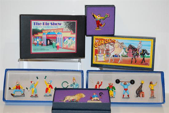 2 VERY RARE SETS OF ALTE DEUTSCHE SPIELFIGUREN CLOWNS AND MIDWAY; THREE BRITAINS CIRCUS SETS INCLUDING 08678; 08672; 08667; AND LIMITED EDITION GINCHY THE BIG SHOW 189/500 (E-M BOXES E-M) (5)