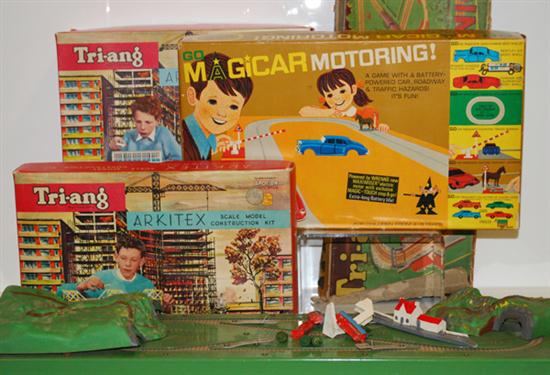 4 TRIANG MINIC MODELS INCLUDING TWO ARKITEX SET, UNCHECKED; GO MAGICAR MOTORING MG1 SET; AND MINIC RAILWAY (ELECTRIC) (G-M BOXES P- E) (4)