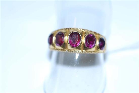 A FIVE STONE RHODOLITE GARNET SET DRESS RING TESTED 22CT GOLD