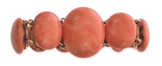 Comprising nine graduating panels set with coral cut en cabochon, in 18ct gold, total length 170mm.