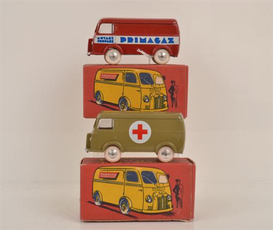 2 QUIRALU CAMIONNETEE PEUGEOT D.4.A, ONE RED WITH 'PRIMAGAZ' TO SIDES; AND ONE OLIVE AMBULANCE POSSIBLY RE-EDITIONED BOTH IN RE-EDITIONED BOXES (E-M BOXES E-M) (2)