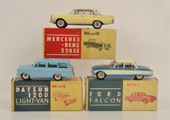 3 CHERRYCA PHENIX MODELS INCLUDING PHE 47 FORD FALCON; PHE 12 DATSUN 1200 LIGHT-VAN; AND PHE 18 MERCEDES BENZ 220SE WITH CELLO TAPE TO LID OF BOX (E-M BOXES G-VG) (3)