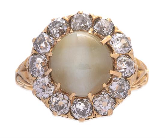 Of cluster design, centrally set with an oval cats eye chrysoberyl, within a border of twelve old European cut diamonds, in 18ct gold, ring size G-H.