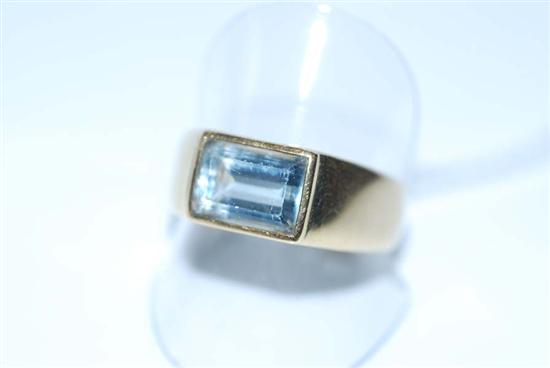 A GENTS AQUAMARINE SET SIGNET STYLE RING IN 18CT GOLD