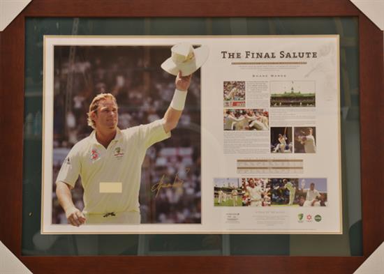 PRICEWATERHOUSECOOPERS 'SHANE WARNE- THE FINAL SALUTE-'A PIECE OF THE ACTION'' LITHOGRAPH WITH SHANE WARNE SIGNATURE, LIMITED EDITION 319/350 WITH A SWATCH FROM ONE OF THE SHIRTS WORN BY SHANE WARNE DURING THE FINAL TEST MATCH 2-5 JANUARY 2007 (M)